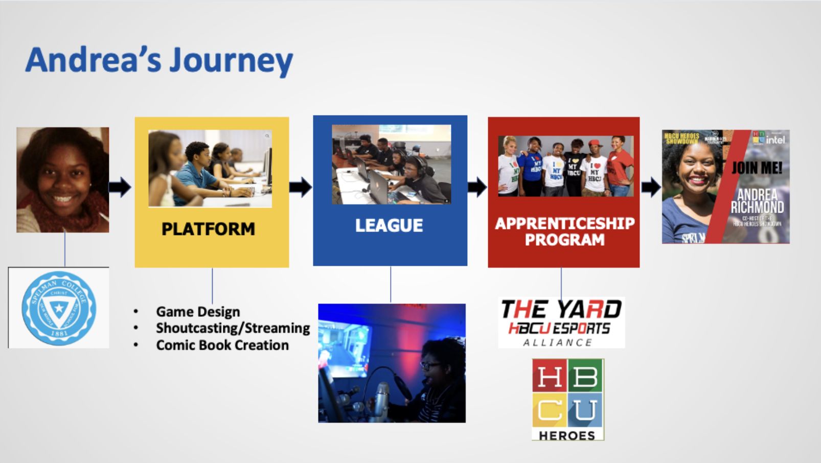Andrea Richmond came to us as a high school student who wanted to be a game developer and a shoutcaster (a person who calls the play-by-play action during an eSports competition).